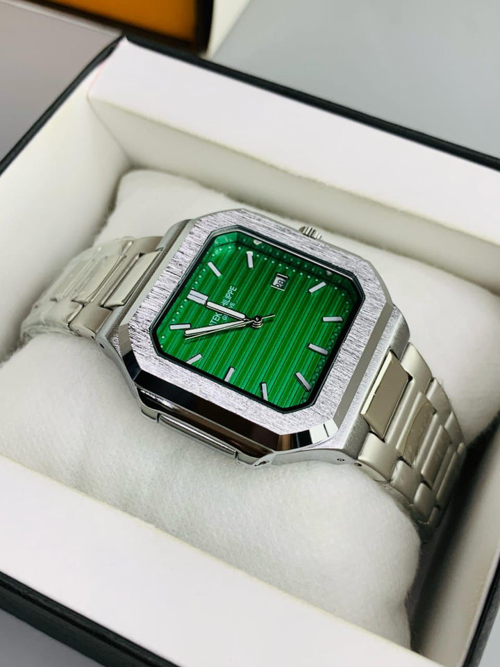 The watch features a square-shaped case with rounded corners and an octagonal bezel, offering a modern yet classic aesthetic. The case is made of a brushed steel finish, with contrasting polished accents.